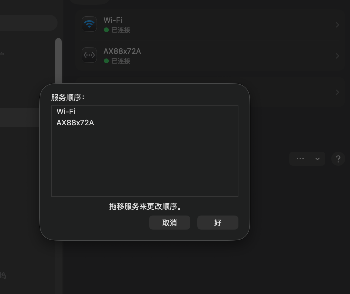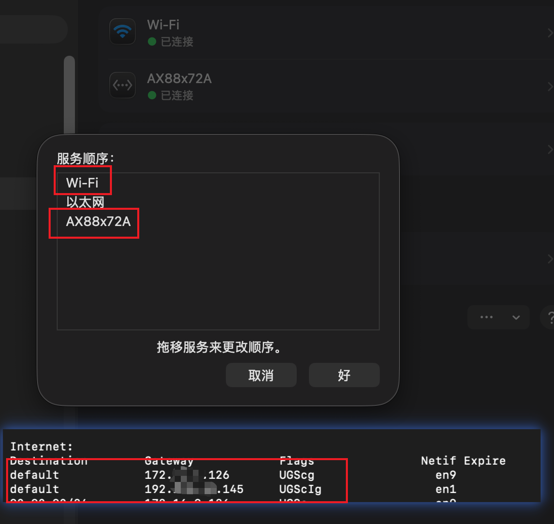 macOS 会根据服务顺序选择首选网卡,默认可能优先使用有线网络,导致无法访问互联网。